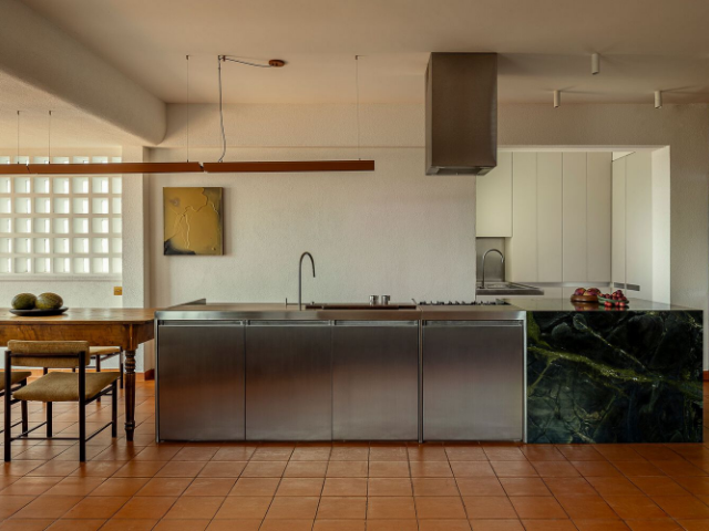The new design articulates a range of materials — steel, stone, and wood. These choices engage in a dialogue without hierarchy, creating expressive yet balanced contrasts. The selection also fulfills a long-held desire of the residents: to explore unconventional finishes and textures in a home setting, introducing materials typically associated with industrial or commercial spaces — such as stainless steel and brass — in direct contrast with natural surfaces, without losing a sense of warmth.