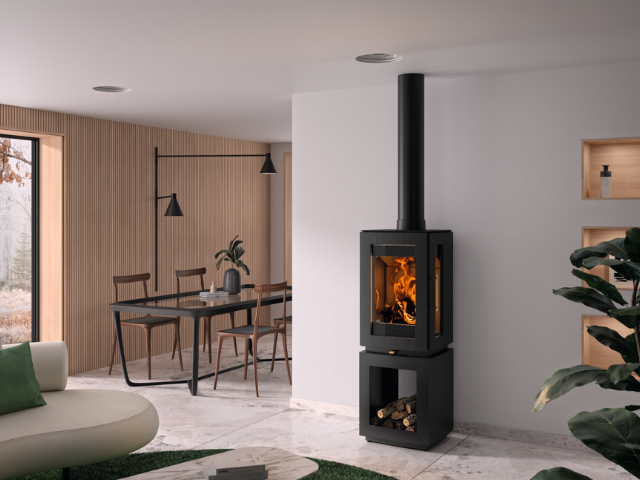 The Hergóm Glow Wood Storage wood-burning fireplace combines elegance and practicality to transform your living space. Its stylish design features a seamlessly integrated log storage compartment, making it both a visual centrepiece and a functional asset. Sleek lines and a large glass front and side panels showcase the vibrant flames, creating a captivating ambiance with every fire.