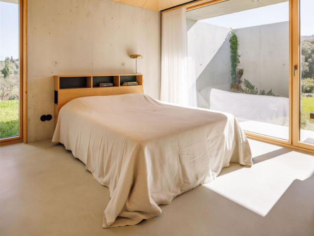 To take advantage of the solar orientation and the views over the protected landscape of the mountain range, the house opens predominantly to the south. The walls, 2.4 meters high, extend the interior spaces beyond the perimeter of the regular four-pitched roof that rests upon them, creating outdoor areas with varying levels of intimacy. This ensures privacy from the proximity of the street to the north and the adjacent land to the west, while also allowing natural light to enter through large glazed openings.