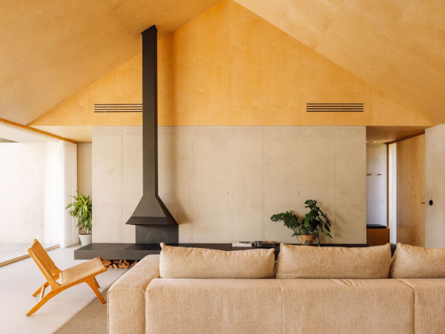 The tectonic character of the construction is emphasized by the choice of materials. The warmth of birch wood on the interior ceilings contrasts with the imposing presence of exposed concrete on the walls, which provides a coherent architectural language throughout the house. On the exterior, the concrete, natural zinc roofing, and aluminum cladding that protects the window frames ensure that the house will age naturally and require minimal maintenance.