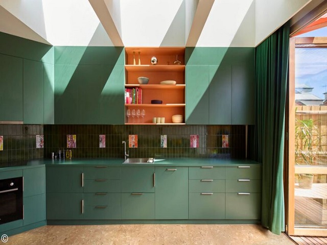 The kitchen itself is a statement of colour and function. Emerald green joinery is paired with a bottle-green splashback featuring custom tiles designed by a local artist and friend of the owners, creating a striking backdrop for food preparation and social gatherings. The layout and furnishings are highly adaptable: the couch doubles as a dining bench, the dining table can become an impromptu kitchen island during cocktail parties, and the adjoining deck acts as a spill-out area for alfresco dining. Built-in seating encourages guests to flow seamlessly between inside and out, turning the home into an extension of the social experience.