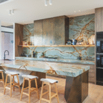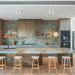 The result is a kitchen that blends bold materiality with quiet warmth, creating a sense of earthy drama that never overwhelms.