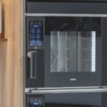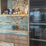 A floating timber shelf stretches across the splashback, offering a simple horizontal line that breaks up the vertical expanse of stone. Its placement brings a sense of comfort and everyday usability to a design that otherwise leans toward the dramatic. Integrated appliances – including the technologically advanced, self-cleaning Unox Casa SuperOven Model 1 Black Edition – support both aesthetic cohesion and culinary performance. Operated via an intuitive digital control panel and equipped with more than 400 automatic cooking programs, the versatile SuperOven – the first true professional oven for the home – sets a new benchmark in speed, reliability and quality, making restaurant-level results effortless for home chefs. Its inclusion reinforces the kitchen’s balance of beauty and function, ensuring daily use feels as considered as the design itself.