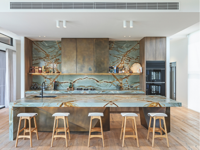 Brass metal features are used with intention, adding depth and subtle sheen. The sculptural brass front to the island transitions from the stone without interruption, creating a layered interplay between matt and reflective surfaces. This detail reinforces the focus on proportion and scale, ensuring the large island feels grounded yet visually refined. The cabinetry continues this tonal story with a timber laminate that introduces softness and warmth. Its gentle grain works as a quiet counterpoint to the stone and metal, providing balance through natural texture.