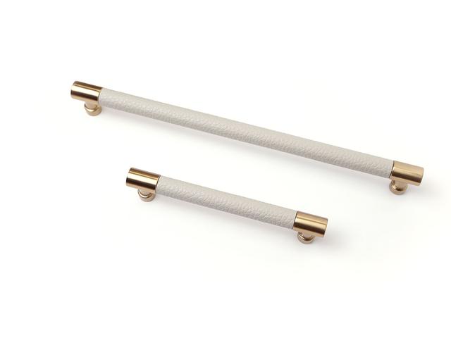Wardrobe Source faux leather-wrapped handles — available in three profiles, six metal finishes, and three leather tones.