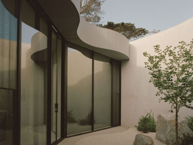 The meandering curves of the façade and associated glazing are a response to the orientation, strategically undulating to create a deep eave over the North and West facing windows. This 3.7m high expanse of glazing provides passive solar gain for the winter months, whilst the substantial eave minimizes the harsh summer sunlight. The internal courtyard provides natural light to the deep clove-shaped plan and excellent cross ventilation across the house. A reductive external material palette of concrete, timber cladding, and natural zinc has been used to accentuate the forms and provide hard-wearing materials which will age gracefully and require low maintenance.