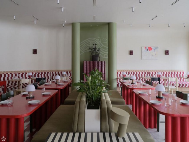 Here, that spirit finds new life through the lens of Kazakh artisans and modern sensibilities. The bistro’s primary hues—scarlet and olive—echo the brand’s palette, reinforcing visual recognition while infusing the interior with warmth and character. Geometric motifs run throughout the design, from built-in structures to custom furniture and wall treatments, establishing a cohesive visual rhythm that mirrors the diversity of Italian cuisine.