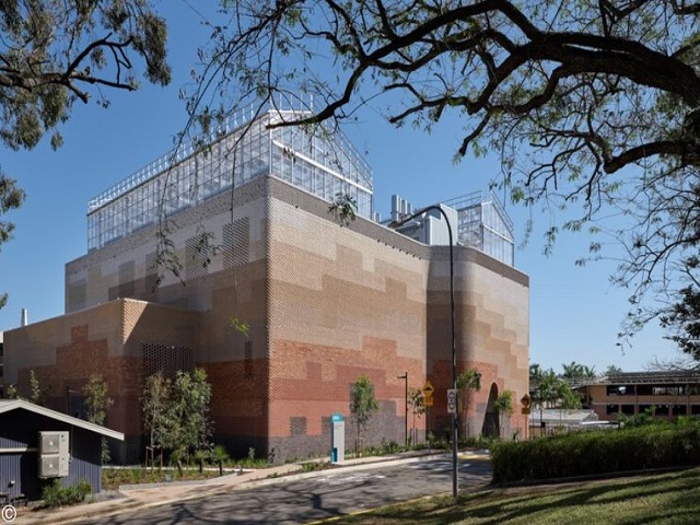 Crafted from brick in a pixilated pattern referencing Queensland’s geological cross-section, the façade shifts in perception depending on proximity. From afar, it reads as a stone wall, while up close, it reveals intricate detail and craftsmanship. This material approach allows the building to integrate seamlessly into its mixed-scale surroundings, bridging the University’s larger service buildings with nearby residential structures.