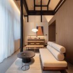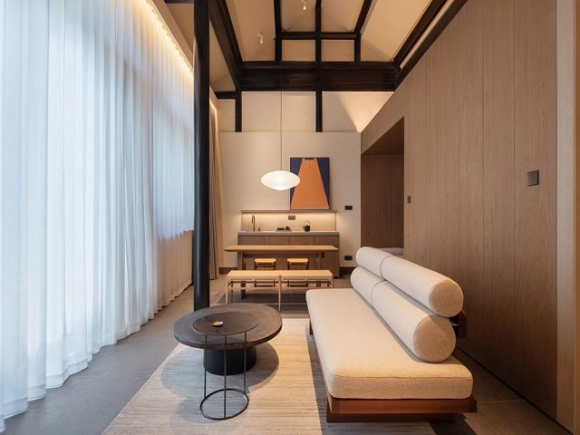 On the western edge of the site, a contemporary multi storey concrete building contains larger suites, each with access to a private courtyard garden. A consistent interior scheme developed by BLUE Architecture Studio ties the diverse structures together, exposing historic timber where possible and pairing it with warm, pared back materials and textured surfaces inspired by traditional craft.