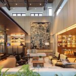 Visitors arrive through a former cinema that has been repurposed as the hotel lobby. The building’s Art Deco frontage, high ceilings and timber roof structure have been preserved, while the interior has been reorganised around a rocky tree garden encircled by bar and café seating. The approach establishes an atmosphere that merges heritage with contemporary hospitality.
