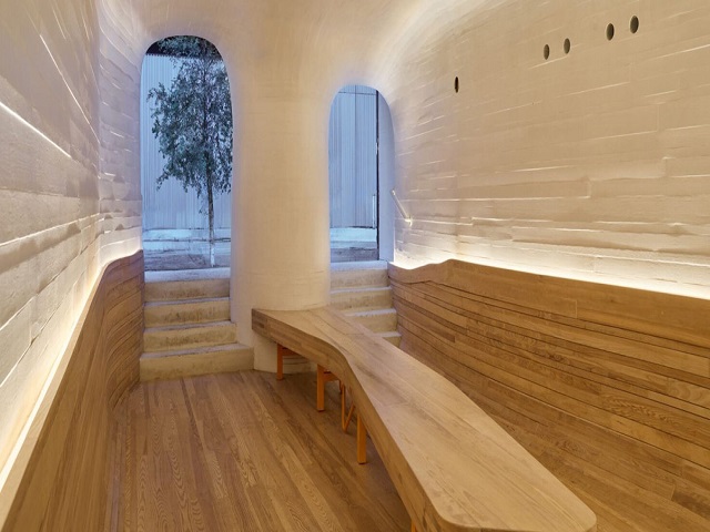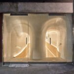 The site sits one metre below street level and measures just 20 metres long by 3.7 metres wide, with a ceiling height of only 2.55 metres. Rather than fight these tight proportions, the architects embraced them. The result is a continuous wooden surface that curves seamlessly across walls and ceiling, wrapping visitors like a cocoon. The handcrafted treatment softens the confines of the interior, making the small footprint feel intentional and immersive.