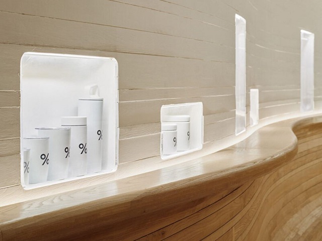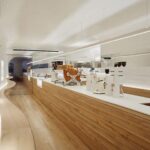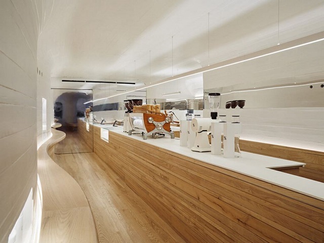 A single 10-metre-long counter stretches almost the entire length of the café, organising the narrow plan and introducing a strong horizontal line. This counter divides the interior into two visual zones. Above, the timber is painted white, bouncing light through the low ceiling and brightening the space. Below, the natural tone of the wood is retained, introducing texture and warmth at eye level and around the body.