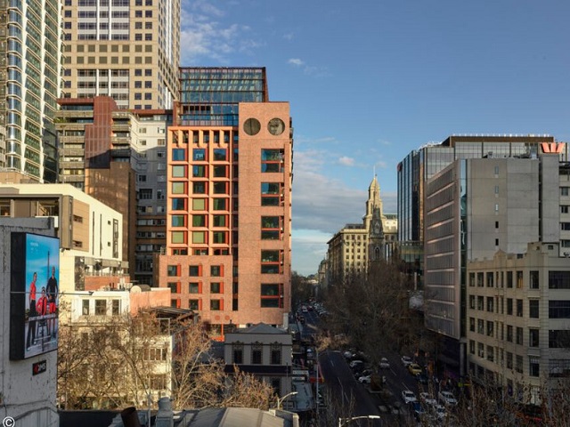 The structure includes two basement levels, a double-height ground plane opening to three street frontages, and a projecting balcony above Russell Street. Its uppermost three levels are set back within a corten brise-soleil that lends a sculptural quality to the form. Embedded in the design is a subtle persona, described as an abstract zoomorphic figure with a long brick neck and oversized eyes gazing north. This conceptual layer guided the design at every stage, giving the building a distinct and memorable presence.