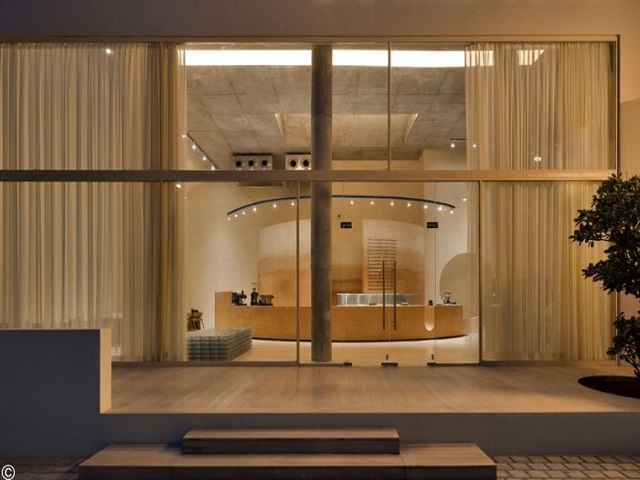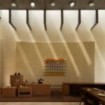Inside, the 22-foot volume is manipulated through rising and dipping ceiling planes rather than exaggerated height. A series of low-hanging beams animate the ceiling, while a volumetric circular cut near the main counter frames staff movement and balances the geometry.
