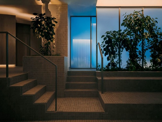 A frosted glass partition separates the hydrotherapy sequence from a flexible lounge space used for programming, from breathwork to DJ sets. Accessed from both hot and cold zones via tiled steps, it reinforces the project’s emphasis on fluid movement between rest, recovery and social connection.