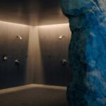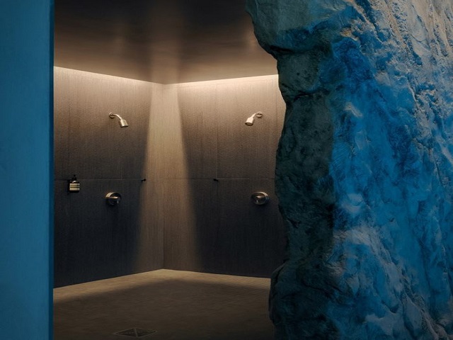 A deliberate tonal shift leads to the cold plunge room, where blue light and reflective surfaces heighten contrast. The illuminated pool accommodates up to 12 people, reframing cold immersion as a shared ritual rather than an individual act. Adjacent rock-like walls conceal showers, with cove lighting casting deep shadows across textured surfaces.