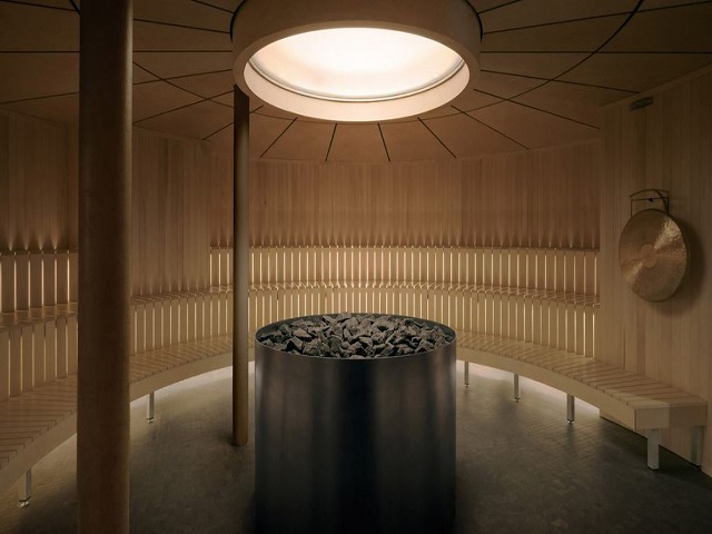 The core of the experience is the circular sauna, where tiered wooden slats wrap the perimeter and a central cylindrical heater anchors the room. Warm, diffused light filters through the timber and an overhead oculus, creating a softened, enveloping glow that reinforces the communal nature of the space.