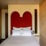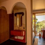 Inside, Paris-based interior designer Dorothée Meilichzon of Chzon studio has drawn on her personal connection to the village, infusing the interiors with Mediterranean texture and Greek symbolism. Many guestrooms feature bare or lime-plastered walls, allowing the mineral-rich tones to remain visible. Red, blue and green accents punctuate the neutral palette, while cut-out alcoves and half-moon nooks create depth and intimacy.