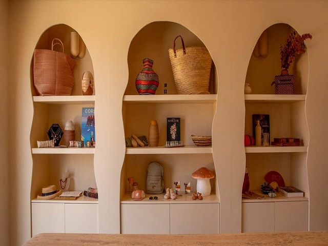Throughout the hotel, design details pay homage to Corsican and Greek influences. Black touches in bedrooms reference the traditional hats of local shepherds, while side tables and carved plaster friezes nod to classical Greek columns and motifs. A monolithic stone reception desk incorporates Ionic scrolls, paired with cave-like shelving that reinforces the organic atmosphere.