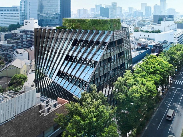 On the Omotesando side, the structure is shaped within its zoning envelope, its glass facade subtly pinched and recessed at both the street and roof levels. These setbacks create a passage that draws people from the tree-lined avenue into the more intimate Oku-Harajuku neighbourhood, while allowing daylight to penetrate deeper into the urban block. Toward Harajuku, the building’s mass steps outward into terraces that act as open-air platforms for events and leisure, extending the building’s activity into the surrounding city.