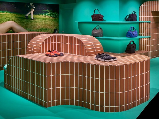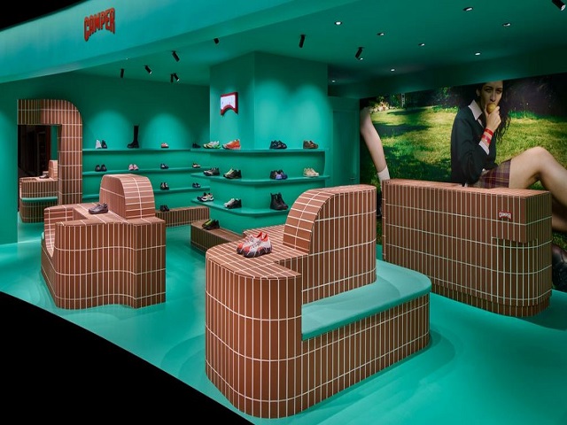 The overhaul presents Camper footwear across a series of curvaceous clay-tiled blocks that function as display stands, seating and a cash desk, all set within an aquamarine-toned interior.
