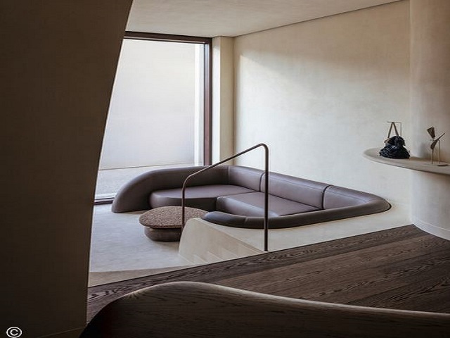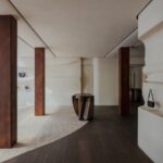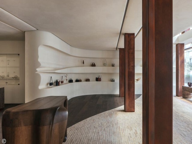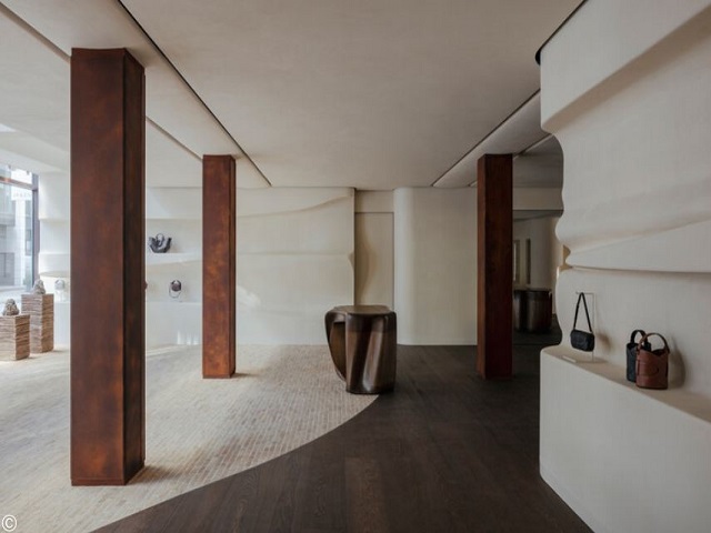 Conceived as a sanctuary for craftsmanship, the space reflects a refined aesthetic defined by clean lines, fluid curves and soft, folded geometries that mirror the brand’s signature approach to leather goods.