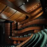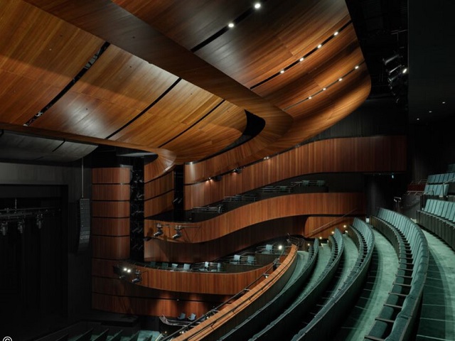 Inside, the light-filled foyers give way to a more immersive auditorium defined by dark ironbark walls and deep green finishes. The theatre is engineered for flexibility, with a maximum viewing distance of just 28 metres and wraparound balconies that foster intimacy. A fully automated fly system, adjustable orchestra pit and multiple staging configurations enable the venue to accommodate opera, ballet, theatre and large-scale musical productions with precision.