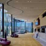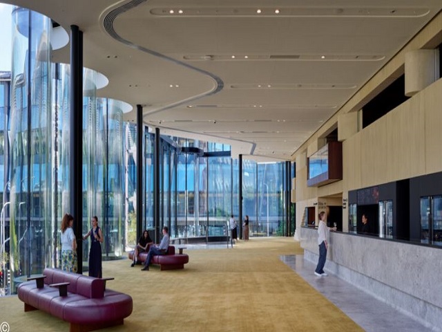 The undulating façade draws from a prose-poem by Aboriginal Elder and artist Lilla Watson, referencing the ripples of the Brisbane River and movement beneath its surface. The glazing is both expressive and technical, comprising four layers with an air gap to enhance thermal performance. Sections exposed to direct sunlight incorporate a black ceramic inlay that functions as a louvre, reducing glare and solar gain while maintaining transparency. The result is a dynamic public interface where activity within the foyers becomes part of the streetscape.