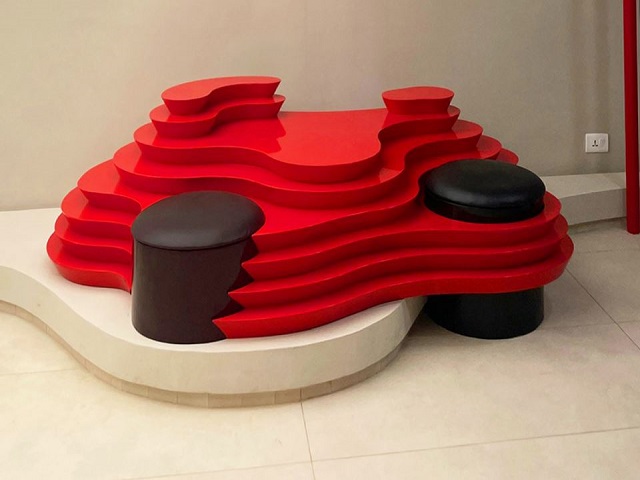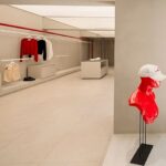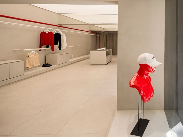Inside, a linear podium organises the plan, integrating the billing desk and product display while concealing back-of-house functions. Suspended above, a sweeping red display rod becomes the primary sculptural element, setting the visual rhythm and drawing the eye through the space. At the centre, a red bench doubles as both seating and focal point, reinforcing the store’s emphasis on minimal elements with strong presence.