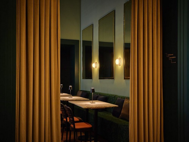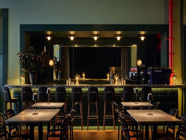 Members enter through a dark green reception area finished with matching mosaic floor tiles, setting a tonal foundation that continues throughout the venue. This arrival sequence leads into the main dining room, conceived as the heart of the club. Here, the space transitions seamlessly from daytime to evening use, supporting coffee meetings, co-working and dining alongside a curated weekly events program.