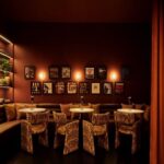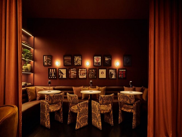 The speakeasy offers a contrasting atmosphere, defined by a rich burgundy palette and detailed millwork that enhances a sense of enclosure. Layered spatial elements, including a curtained banquette niche and a private dining room, provide opportunities for discretion and flexibility.