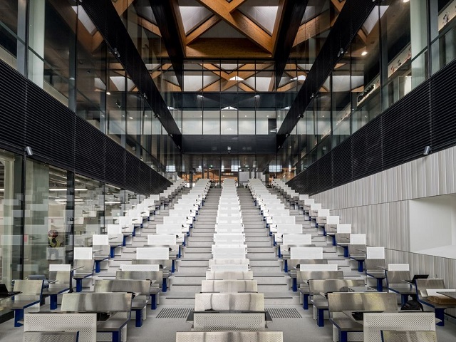 The most distinctive architectural feature is the 200 metre long undulating roof canopy, comprised of 594 timber beams and 407 aluminium cassettes weighing a total of 2,500 tonnes. The pyramidal cassettes are angled to maximise daylight penetration while providing shade. Integrated solar panels, passive ventilation, rainwater harvesting and wastewater treatment systems contribute to reduced energy and water consumption.